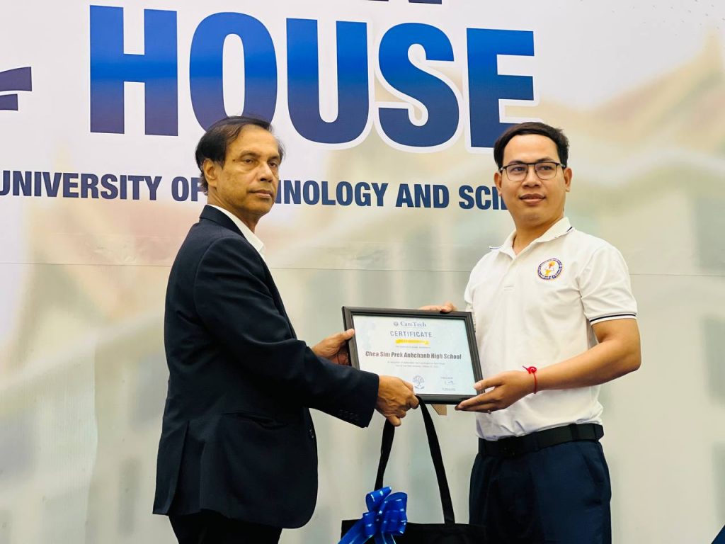 ដឹកនាំសិស្សានុសិស្ស វិទ្យាល័យ សម្ដេចអគ្គមហាធម្មពោធិសាល ជា ស៊ីម ព្រែកអញ្ចាញ កម្មវិធីសាលារៀនជំនាន់ថ្មី ទៅទស្សនកិច្ចសិក្សា នៅសាកលវិទ្យាល័យ បច្ចេកវិទ្យា និងវិទ្យាសាស្ត្រកម្ពុជា(ខេមថិច)។ Students in Chea Sim Prek Anchanh high school visited Cambodia University of Technology and Science (CamTech)