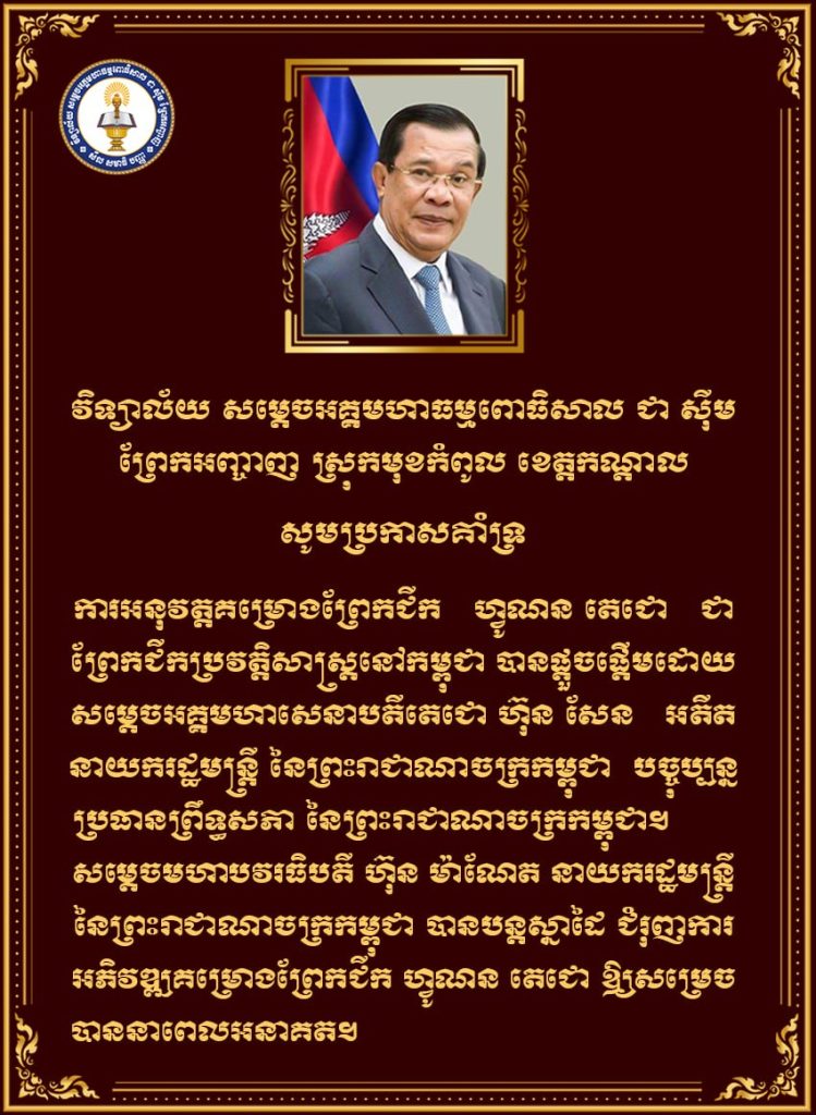 ក្រុមប្រឹក្សាភិបាលសាលារៀន គណៈគ្រប់គ្រង លោកគ្រូ-អ្នកគ្រូ និងសិស្សានុសិស្សទាំងអស់ នៃវិទ្យាល័យ សម្តេចអគ្គមហាធម្មពោធិសាល ជា ស៊ីម ព្រែកអញ្ចាញ ស្ថិតនៅភូមិកណ្តាល ឃុំព្រែកអញ្ចាញ ស្រុកមុខកំពូល ខេត្តកណ្តាល សូមគាំទ្រយ៉ាងពេញទំហឹងចំពោះការអនុវត្តគម្រោងព្រែកជីក ហ្វូណន តេជោ ជាព្រែកជីកប្រវត្តិសាស្ត្រនៅកម្ពុជា ដែលបានផ្តួចផ្តើមដោយសម្តេចអគ្គមហាសេនាបតីតេជោ ហ៊ុន សែន អតីតនាយករដ្ឋមន្ត្រី នៃព្រះរាជាណាចក្រកម្ពុជា និងជាប្រធានព្រឹទ្ធសភា នៃព្រះរាជាណាចក្រកម្ពុជា ហើយបច្ចប្បន្ន សម្តេចមហាបវរធិបតី ហ៊ុន ម៉ាណែត នាយករដ្ឋមន្ត្រី នៃព្រះរាជាណាចក្រកម្ពុជា បានបន្តស្នាដៃ និងជំរុញបន្ថែមក្នុងការអភិវឌ្ឍគម្រោងព្រែកជីក ហ្វូណន តេជោ ឱ្យសម្រេចបាននាពេលអនាគតដ៏ខ្លី។ គម្រោងព្រែកជីក ហ្វូណន តេជោ បានតភ្ជាប់ផ្លូវទឹករវាងទន្លេទៅកាន់សមុទ្រកម្ពុជា ដោយឆ្លងកាត់ខេត្ត Read More …